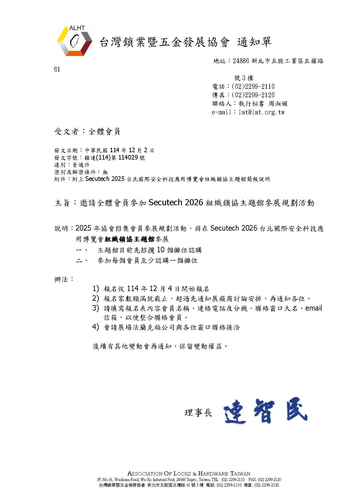 邀請全體會員參加Secutech 2026組織鎖協主題館參展規劃活動