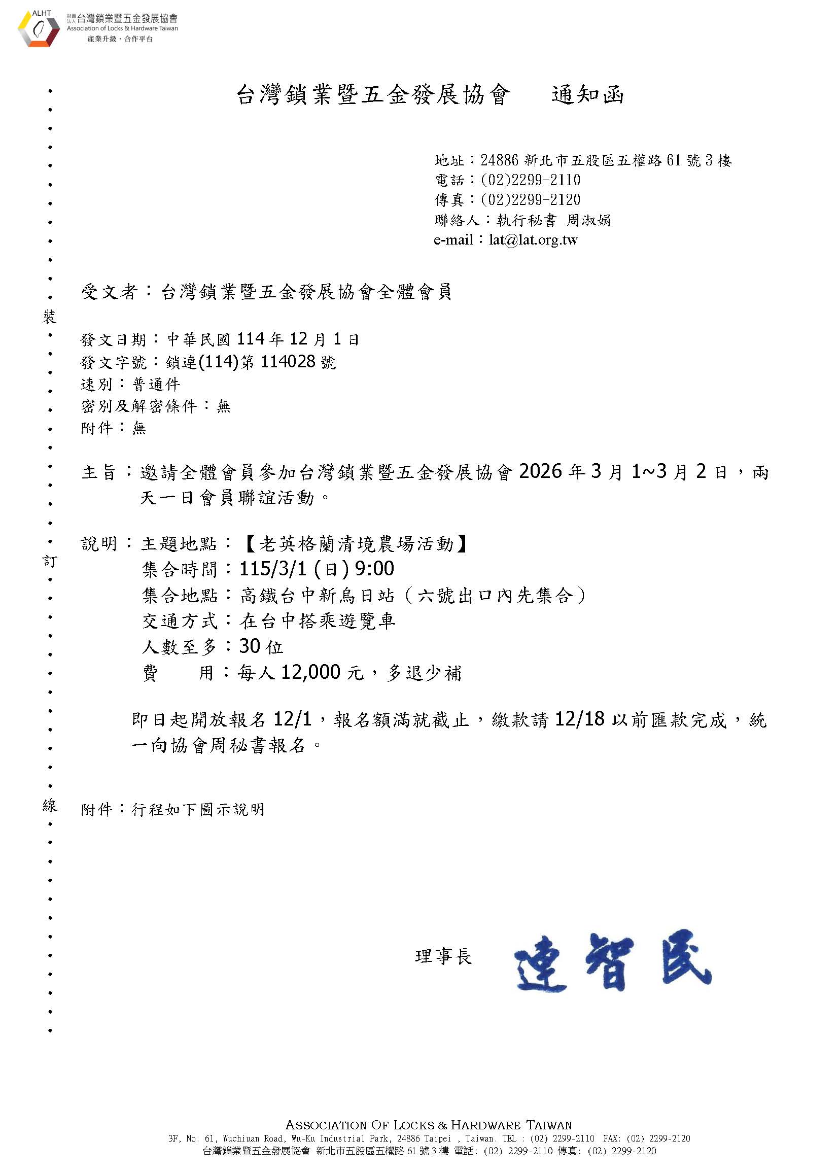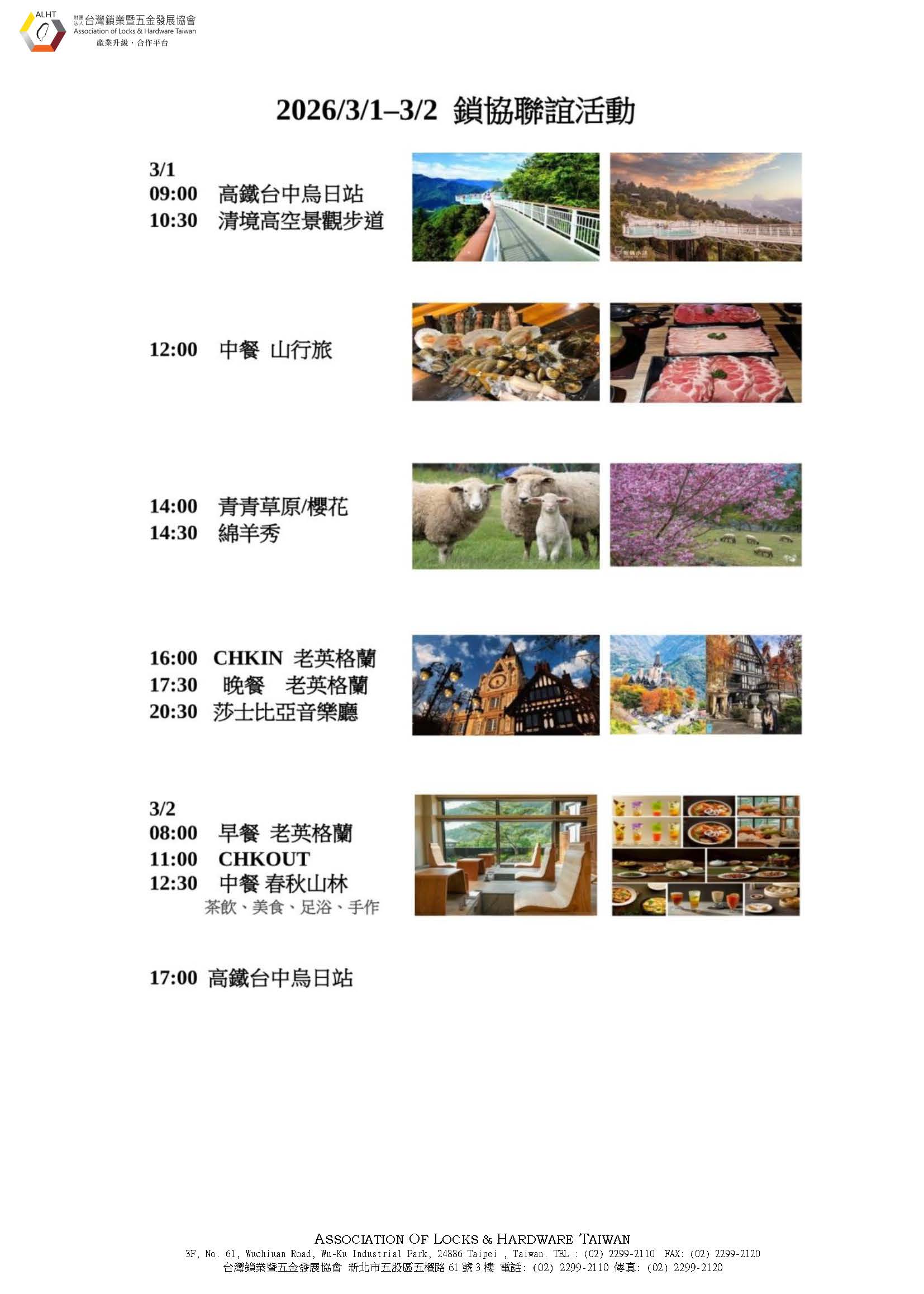 邀請全體會員參加台灣鎖業暨五金發展協會2026年3月1~3月2日,兩天一日會員聯誼活動